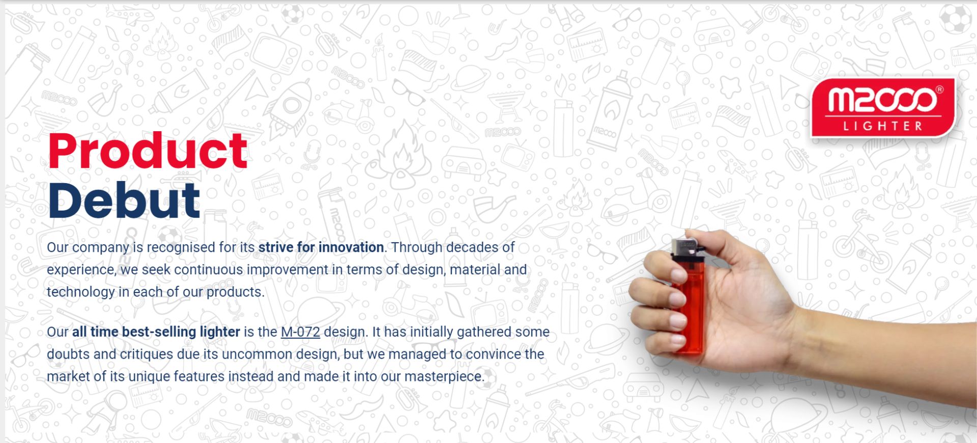 Layanan satu produk korek api kami menjadi produk dengan penjualan terbaik adalah M-072 Produk tersebut mendapatkan beberapa kritik dan sempat diragukan karena mempunyai desain yang tidak umum. Namun kami berhasil meyakinkan pasar dengan mengunggulkan fitur yang unik dan menjadikannya salah satu hasil karya terbesar kami.
