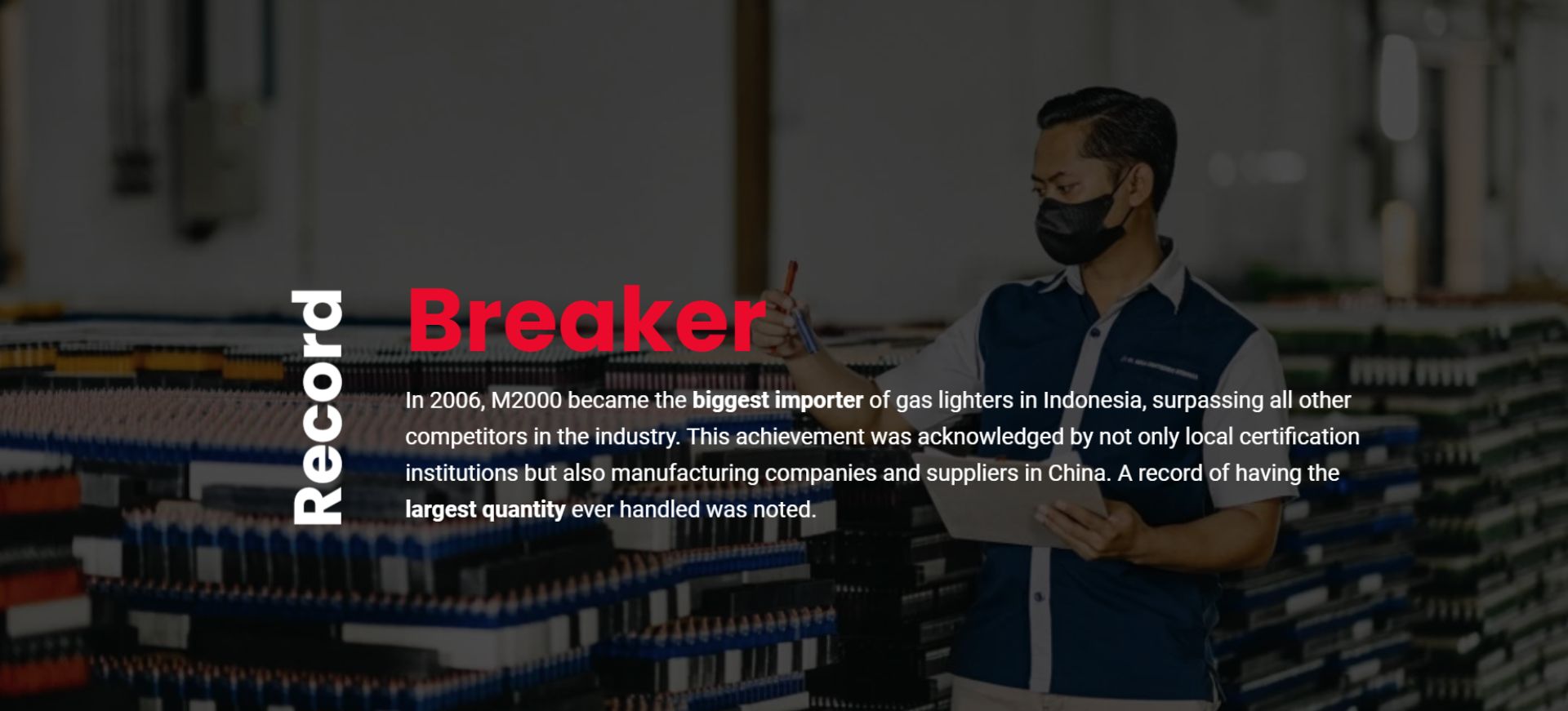 Pada tahun 2006, M2000 menjadi salah satu importir korek gas di Indonesia, melampaui semua kompetitor dalam industri yang sama. Pencapaian ini diakui tidak hanya dari sertifikasi dari institusi lokal namun juga perusahaan pembuat dan juga supplier pembuat dan juga supplier dari Cina. Sebuah pencapaian dengan menjadi jumlah terbesar yang pernah tercatat.