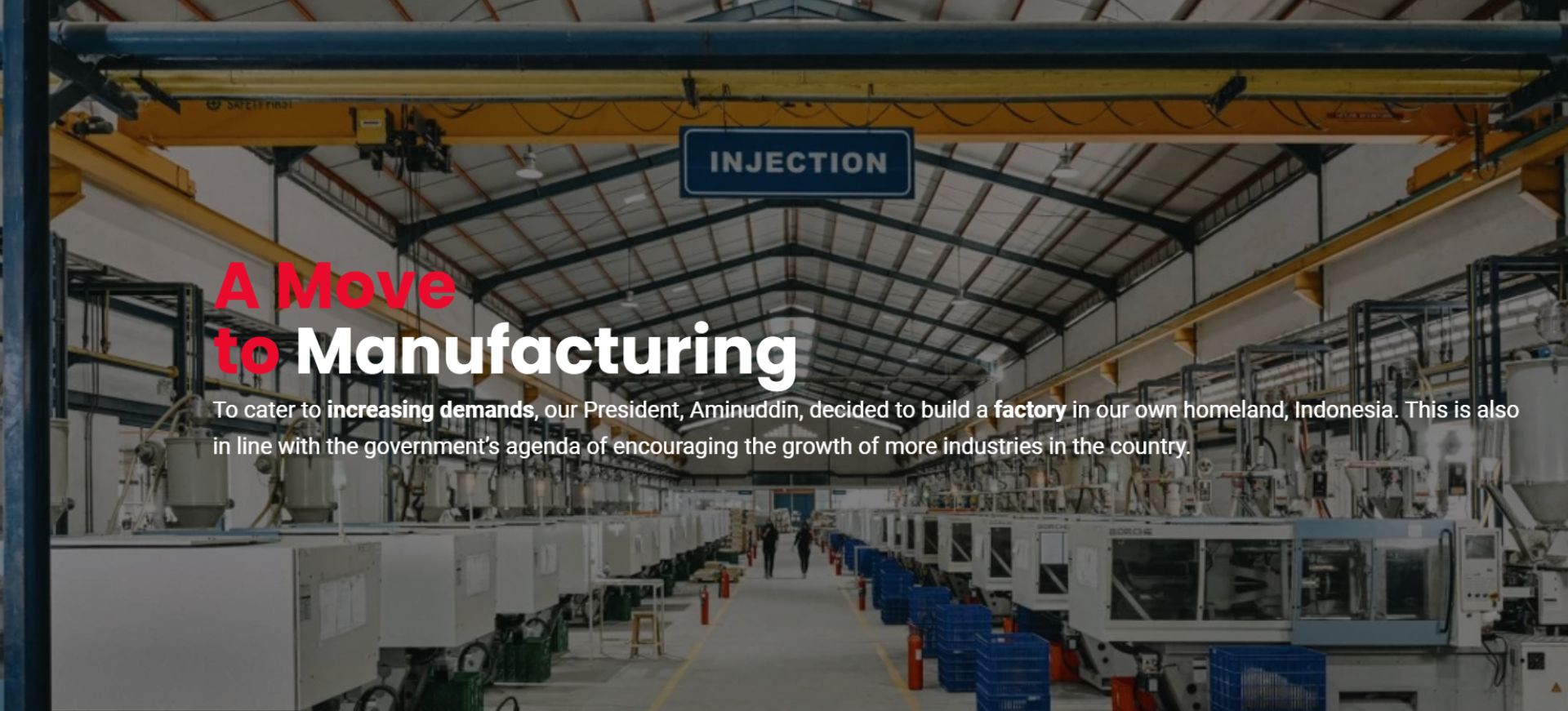 Untuk memenuhi semua permintaan yangterus bertambah, presiden kami, Aminuddin, memutuskan untuk mendirikan pabrik di Indonesia. Hal ini juga sejalan dengan agenda pemerintah yang mendorong pertumbuhan lebih banyak industri dalam negeri.