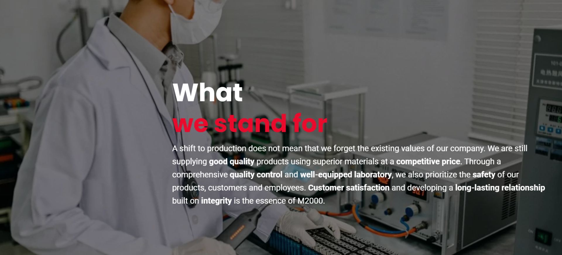 Pergantian produksi bukan berarti kami melupakan nilai perusahaan yang sudah ada. Kami masih menyediakan produk dengan kualitas bagus menggunakan bahan unggulan denganharga yang kompetitif. Melalui kontrol kualitas yang omprehensif dan laboratorium denganperalatan lengkap, kami memprioritaskan keamanan produk, pelanggan, dan pegawai kami. Kepuasan pelanggan dan mengembangkan hubungan berkelanjutan berdasarkan integritas menjadi dasar M2000.